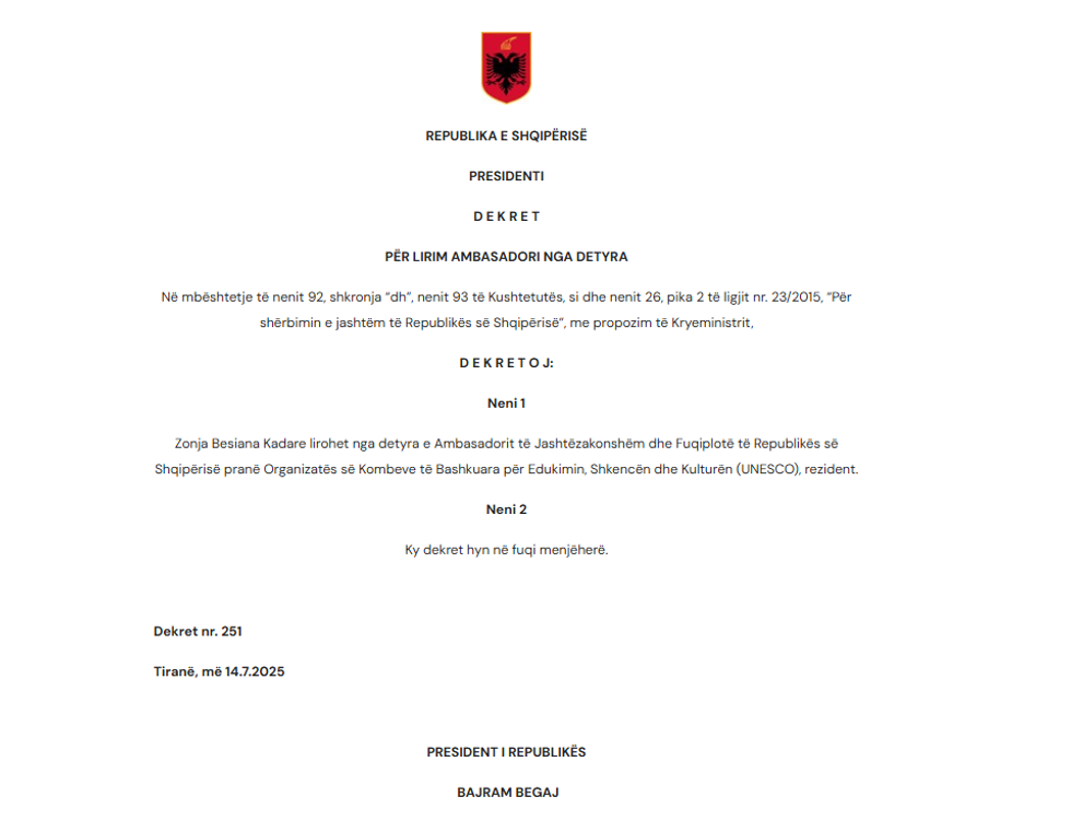 Presidenti i Shqipërisë, Bajram Begaj, ka dekretuar më 14 korrik, lirimin nga detyra të ambasadores së Shqipërisë pranë Organizatës së Kombeve të Bashkuara për Edukimin, Shkencën dhe Kulturën (UNESCO), Besiana Kadare.