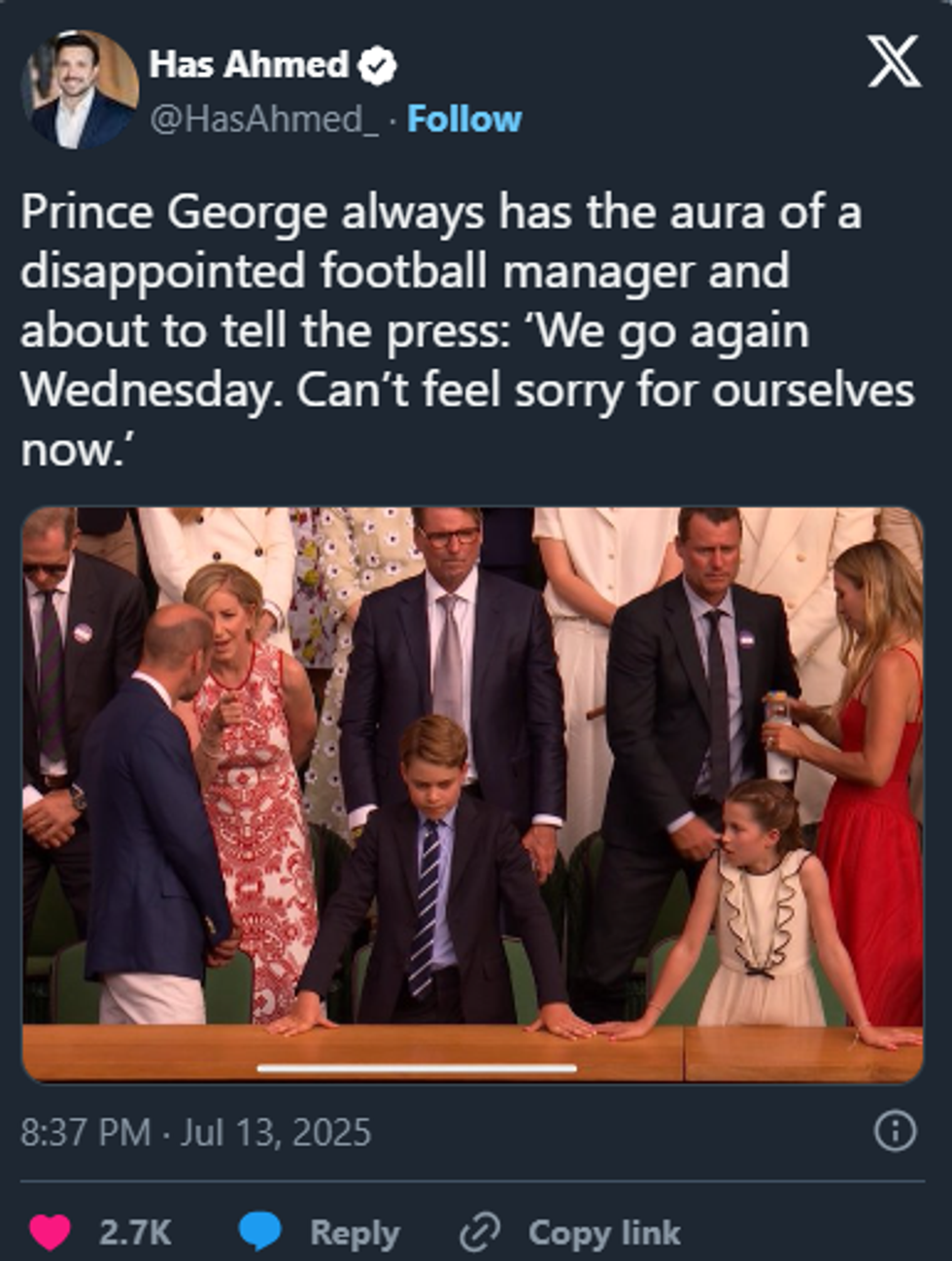 Një foto e tij duke mbajtur gardhin e kutisë mbretërore me duar pas finales së Wimbledonit pushtoi rrjetet sociale dhe nuk vonoi shumë për t’u bërë frymëzim për ‘meme’.