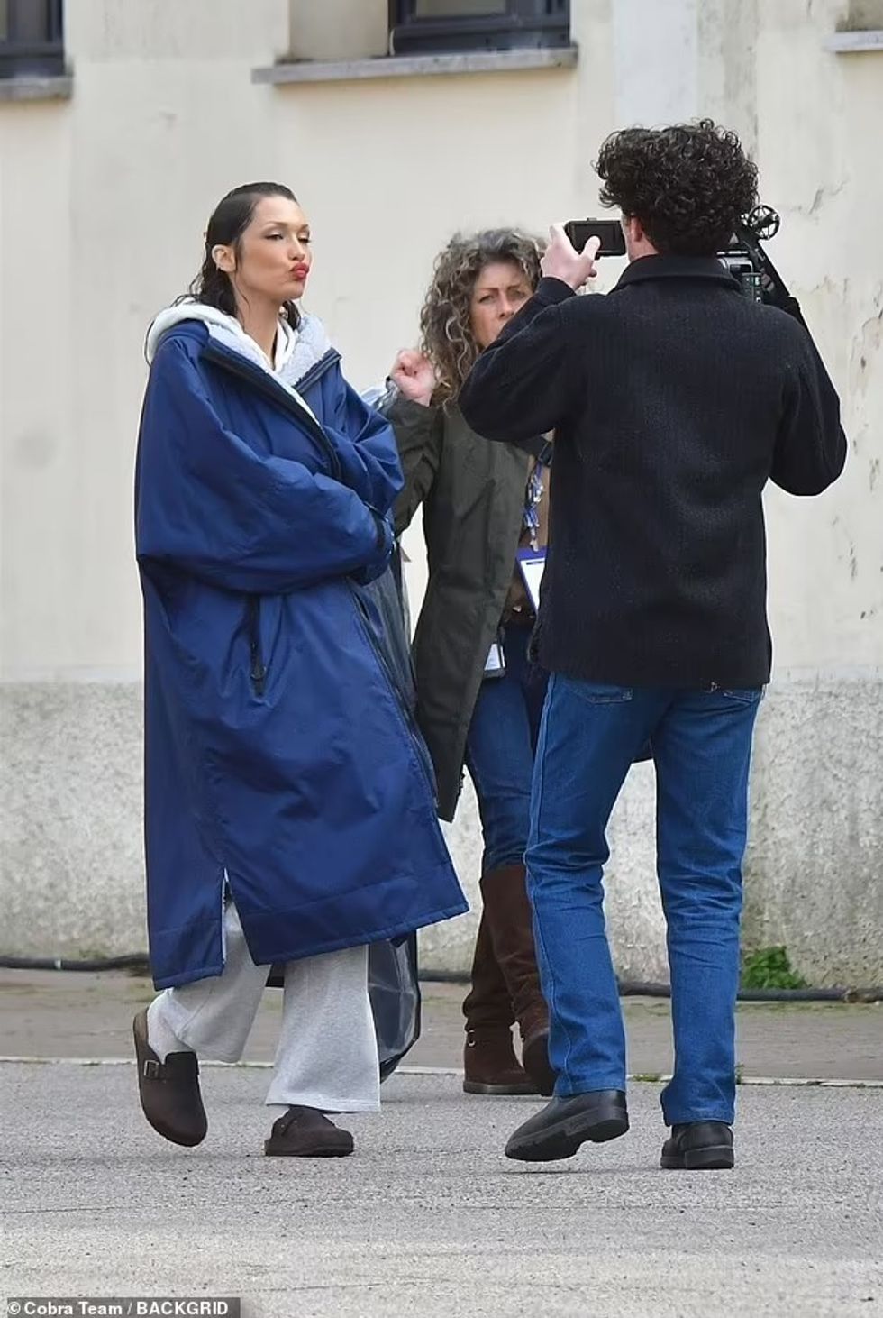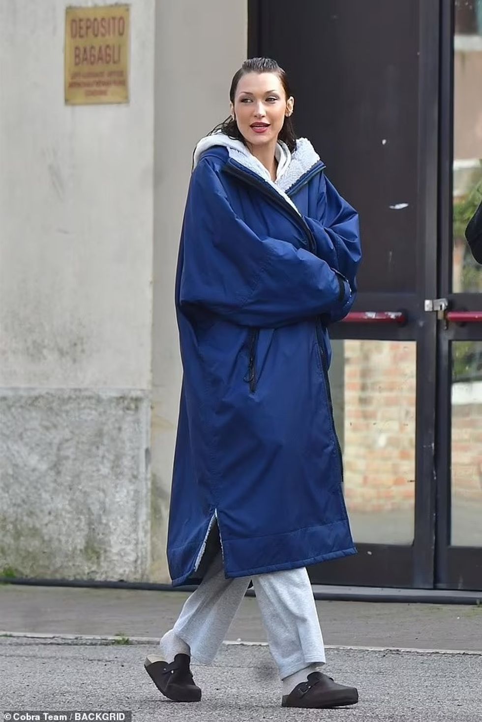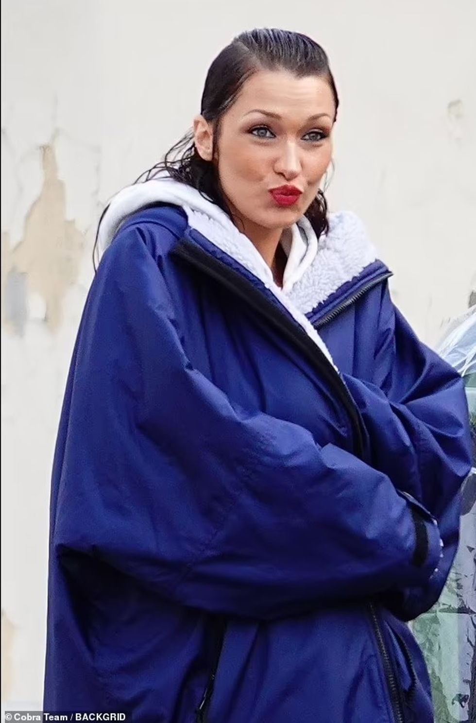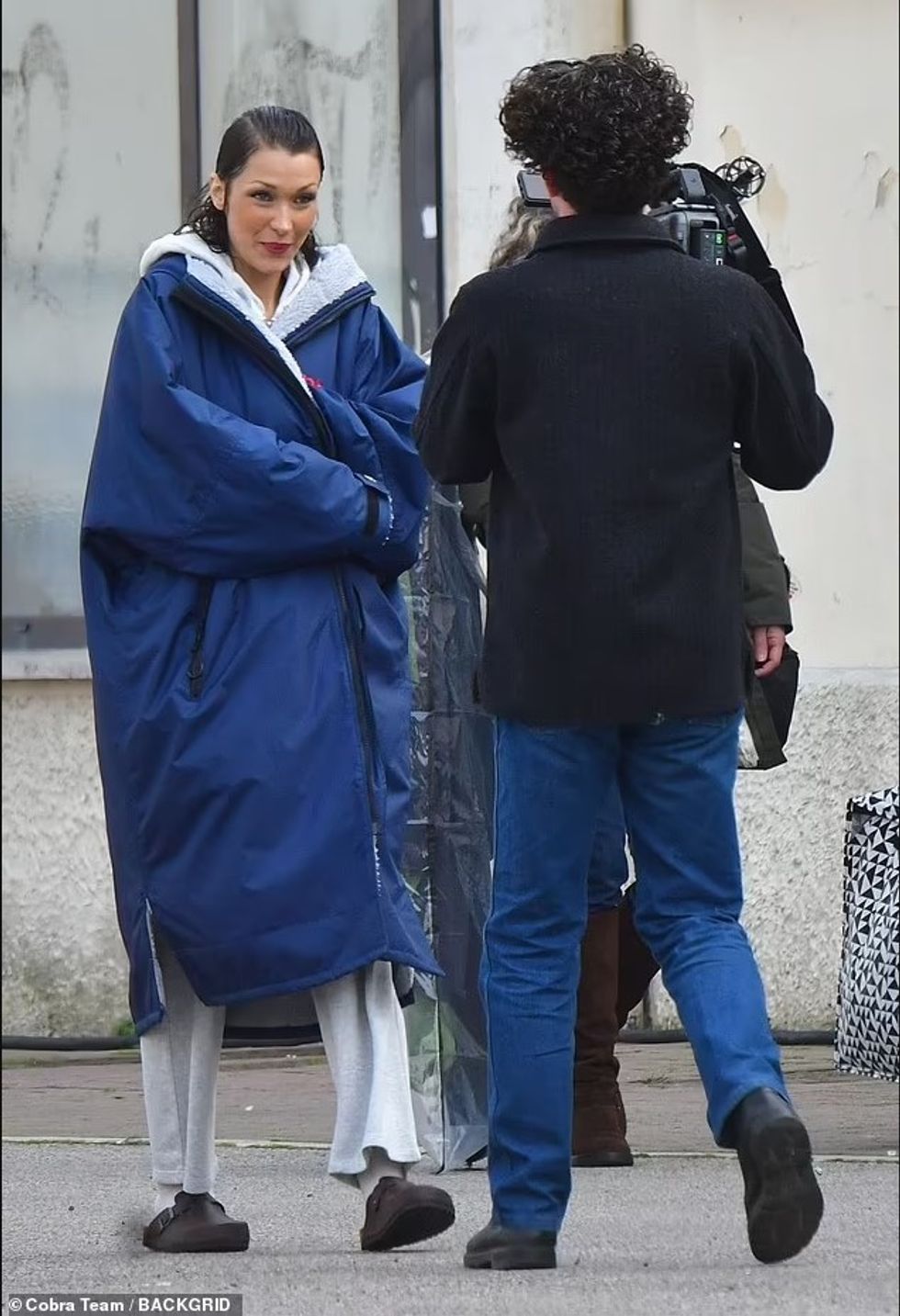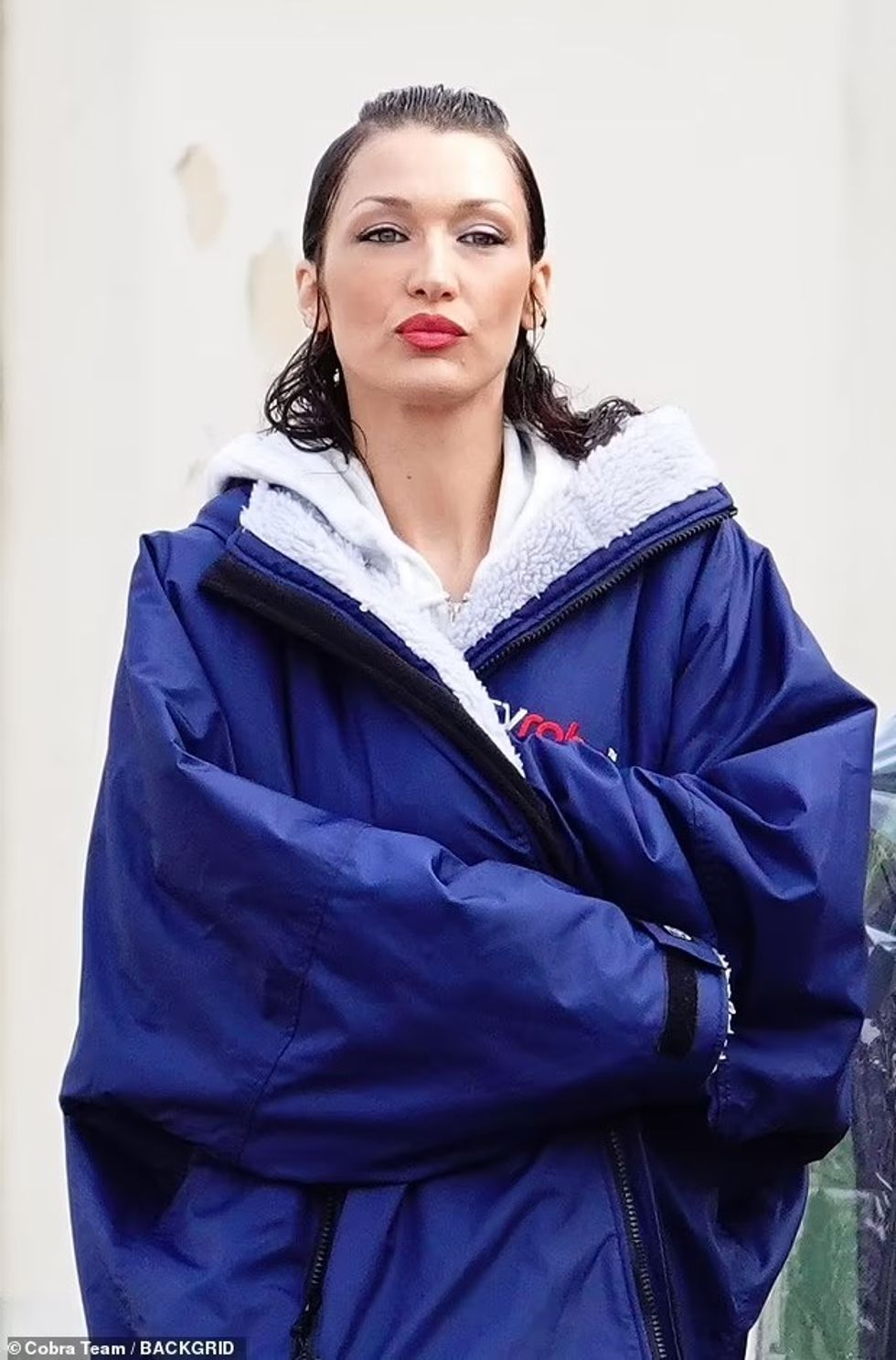 Gjatë xhirimeve në temperaturat e ftohta, Bella u mbështoll me një pallto të madhe Dry Robe me kapuç blu dhe lesh të bardhë, mbi një bluzë të bardhë dhe pantallona sportive gri, shkruan DailyMail.