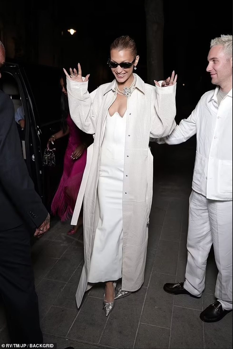 Më vonë, Bella u pa me një tjetër fustan impresionues, vintage me prerje të thellë dhe fund asimetrik, teksa largohej nga hoteli “Connaught”.