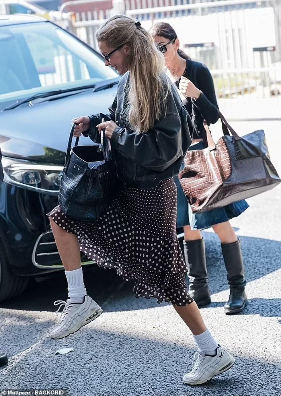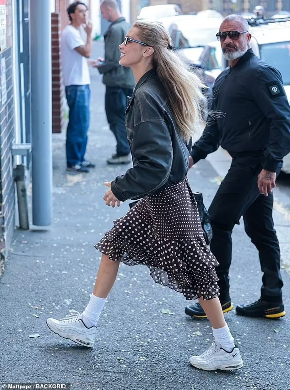 Për të ruajtur rehatinë gjatë ditës, Bella kishte zgjedhur një palë atlete të bardha Nike dhe çorape të bardha të gjata që i shtonin një prekje sportive veshjes së saj plot stil.
