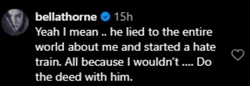 Në një koment në Instagram, Thorne shkroi: “Ai i gënjeu të gjithë botës për mua dhe nisi një tren urrejtjeje… sepse nuk doja të flija me të”.