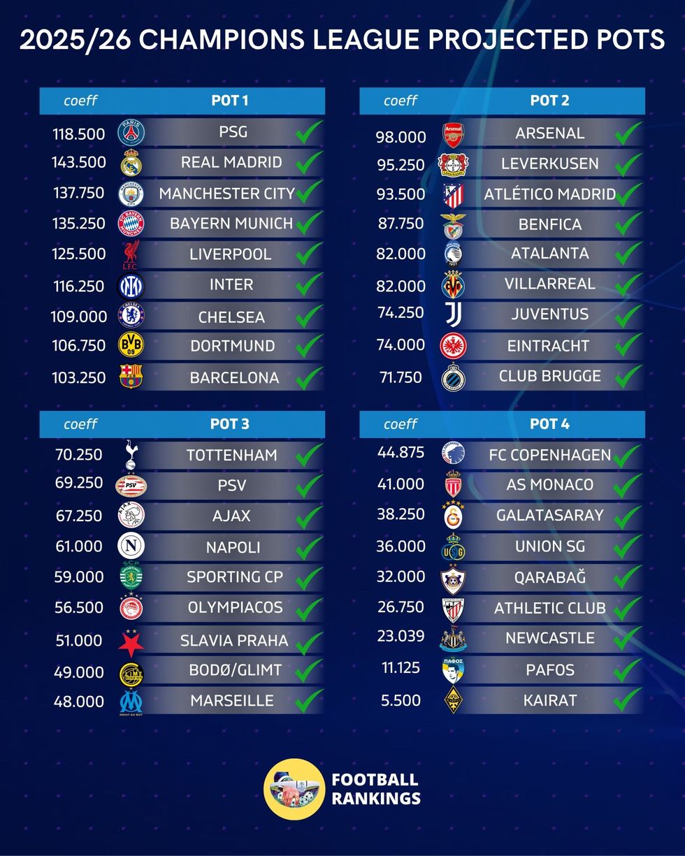 Në fazën e grupeve të Ligës së Kampionëve këtë sezon do të marrin pjesë: Ajax, Arsenal, Atalanta, Athletic Bilbao, Atletico Madrid, Borussia Dortmund, Barcelona, Bayern, Bodo/Glmit, Chelsea, Eintracht Frankfurt, Galatasaray, Inter, Juventus, Bayer Leverkusen, Liverpool, New Marcaseill Olympiacos, PSG, PSV, Real Madrid, Slavia Prague, Sporting, Tottenham, Union SG, Villarreal, Qarabag, Club Brugge, Benfica, Kopenhagen, Pafos, Kairat.