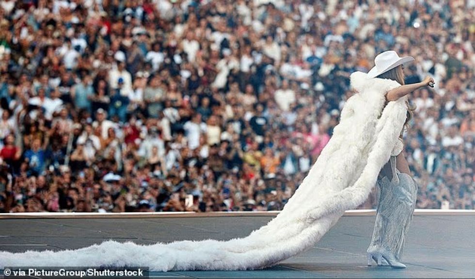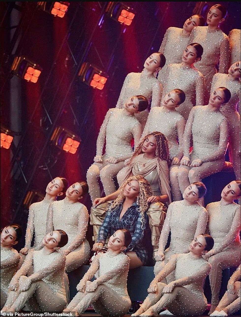 E veshur me një korse të shndritshëm argjendi, pantallona të shkurta me bel të lartë dhe çizme të gjata kaubojsh, Beyonce ndezi atmosferën, ndërsa jeleku prej leshi me bisht të gjatë i rridhte pas.