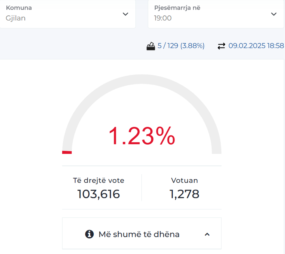 Në Komunën e Gjilanit nga 15:00 deri në ora 19:00, nga 103 mijë e 616 qytetarë me të drejtë vote, kanë votuar 1278, apo 1.23 përqind.