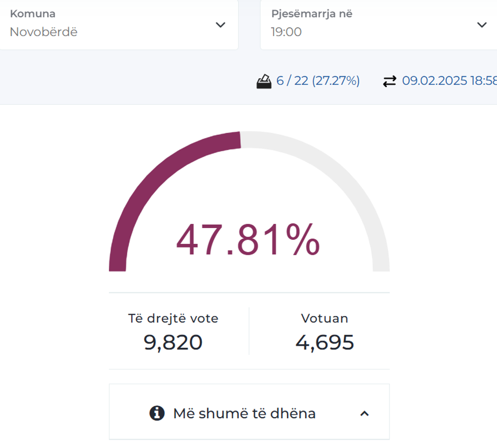 Ndërsa, në Komunën e Novobërdës kanë votuar 4695 qytetarë nga 9820 sa kanë të drejtë vote. Deri në ora 19:00 është regjistruar 47.81 përqind e votuesve në këtë komunë.
