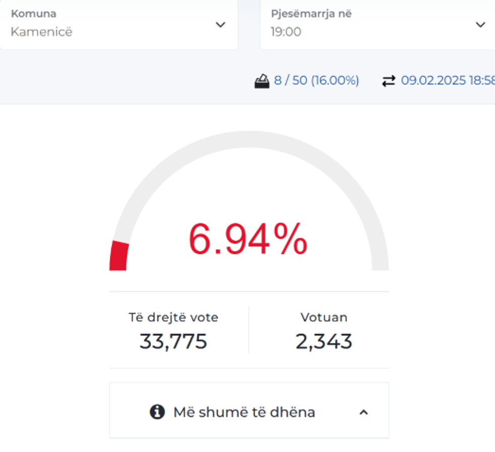 Ndërsa, në Komunën e Kamenicës kanë votuar 2343 qytetarë nga 33 mijë e 775 sa kanë të drejtë vote. Nga 15:00 deri në ora 19:00 është regjistruar 6.94 përqind e votuesve në këtë komunë.