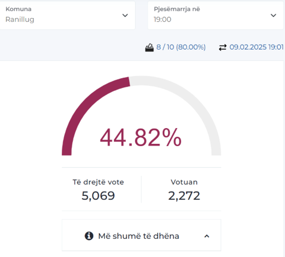 Në Komunën e Ranillugut nga 5069 votues, deri në ora 19:00 kanë votuar 2272 qytetarë, apo 44.82 përqind.
