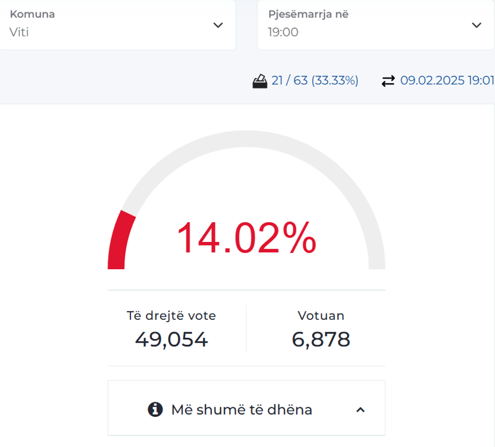 Në Komunën e Vitisë nga 49 mijë e 54 votues, deri në ora 19:00 kanë votuar 6878 qytetarë, apo 14.02 përqind.