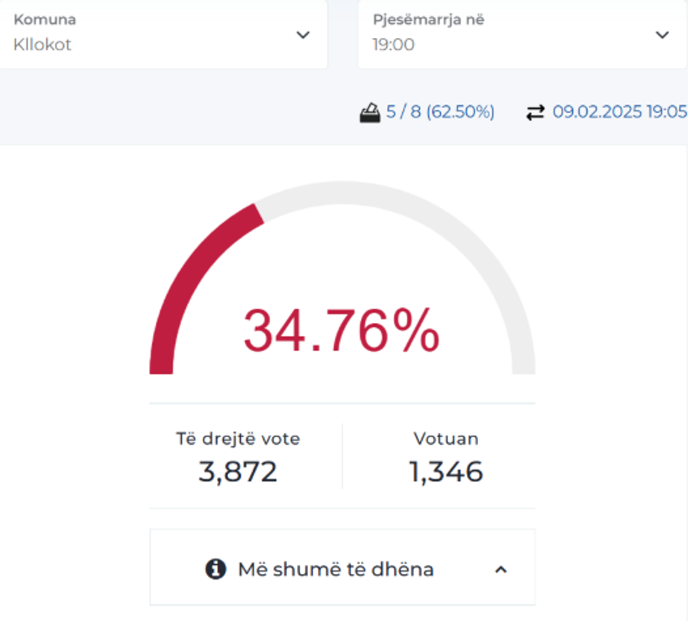 Në Komunën e Kllokotit nga 3871 votues, deri në ora 19:00 kanë votuar 1346 qytetarë, apo 34.76 përqind./Telegrafi/