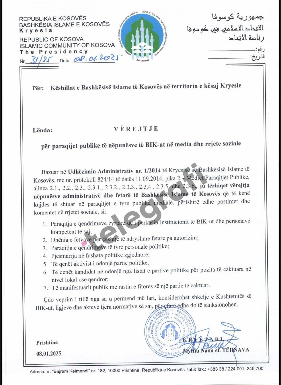 “Sipas Udhëzimit Administrativ nr. 1/2014, janë ndaluar këto veprime: Shprehja e qëndrimeve zyrtare të BIK-ut pa autorizim, dhënia e fetvave pa miratimin përkatës, shprehja e qëndrimeve personale me karakter politik, pjesëmarrja në fushata politike apo angazhimi si aktivist në parti politike, kandidimi në lista të partive politike dhe manifestimi publik me rastin e fitores së një partie të caktuar”, thuhet mes tjerash në vërejtjen e BIK-ut.