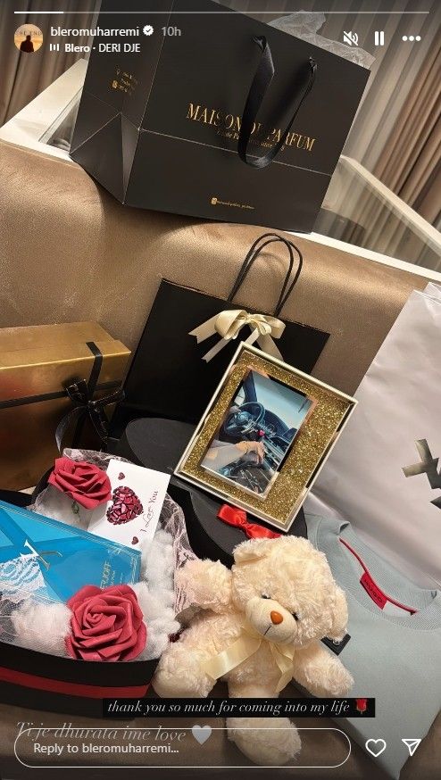 Përmes një fotografie të postuar në Instagram Story, Blero ka treguar një mori dhuratash që ia ka kushtuar partneres së tij – një shfaqje romantike me parfume luksoze, arushë lodër, kuti të zbukuruara, lule të freskëta, kartolina dashurie dhe një kornizë me foto intime të çiftit.