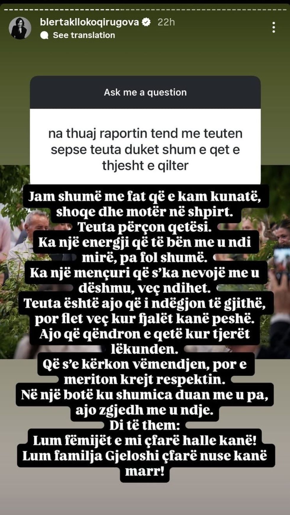Blerta u përgjigj me ndjeshmëri dhe respekt të thellë, duke e cilësuar Teutën si një njeri të rrallë.