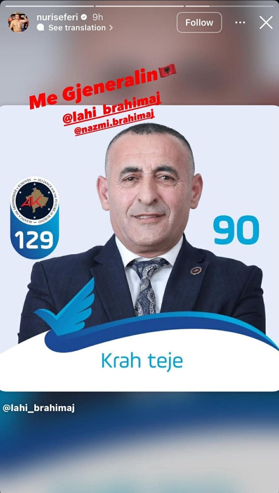 Mbështetja e Nuri Seferit, një emër i njohur i sportit shqiptar dhe ish-kampion bote në boks, vlerësohet si një përkrahje e rëndësishme në prag të zgjedhjeve, duke i dhënë shtysë fushatës së Lahi Brahimajt në garën për Kuvendin e Kosovës. /Telegrafi/