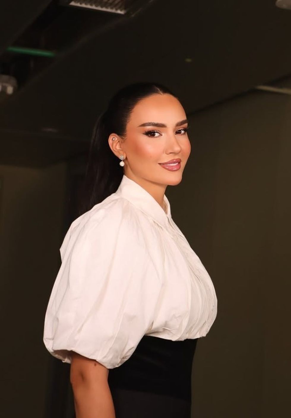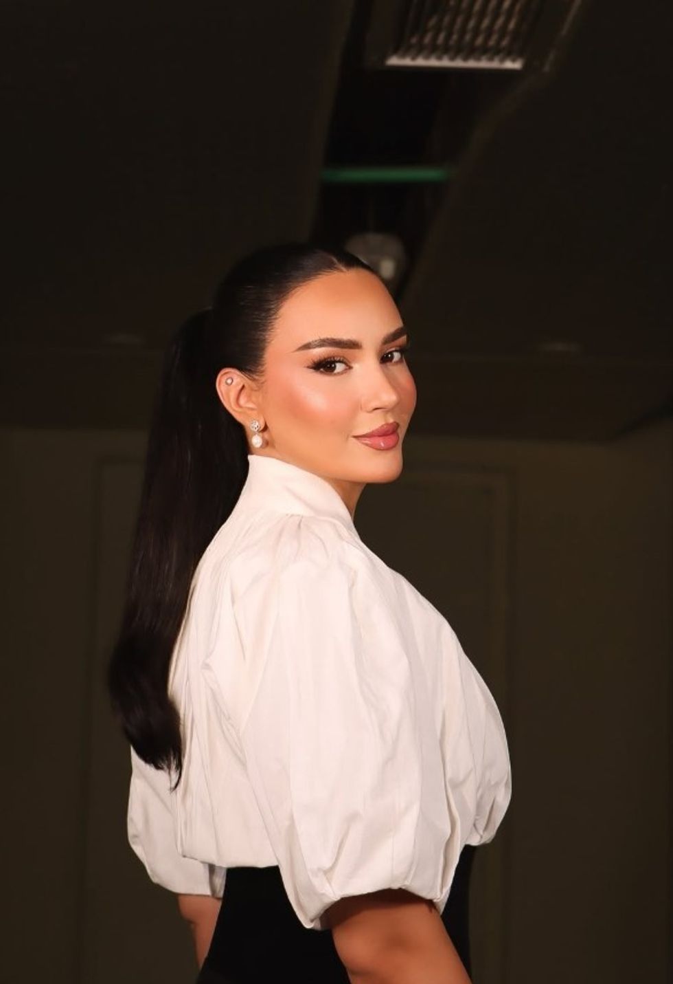 Flokët i kishte të lidhur bisht të lartë dhe të drejtë, një stil i thjeshtë, por që shtoi më shumë finesë dhe theksoi tiparet e saj elegante.