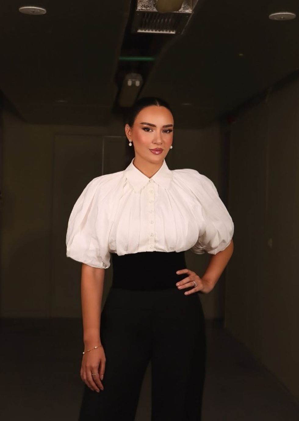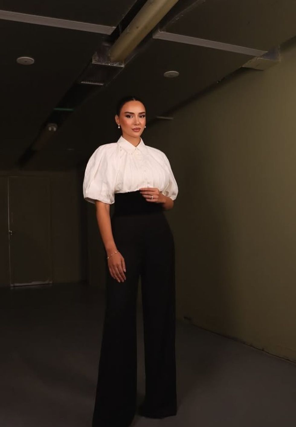 Bora kishte zgjedhur një kombinim klasik bardhë e zi, me një këmishë të bardhë me mëngë të fryra dhe detaje të lehta pala, të kombinuar me pantallona të gjera me bel të lartë në ngjyrë të zezë.