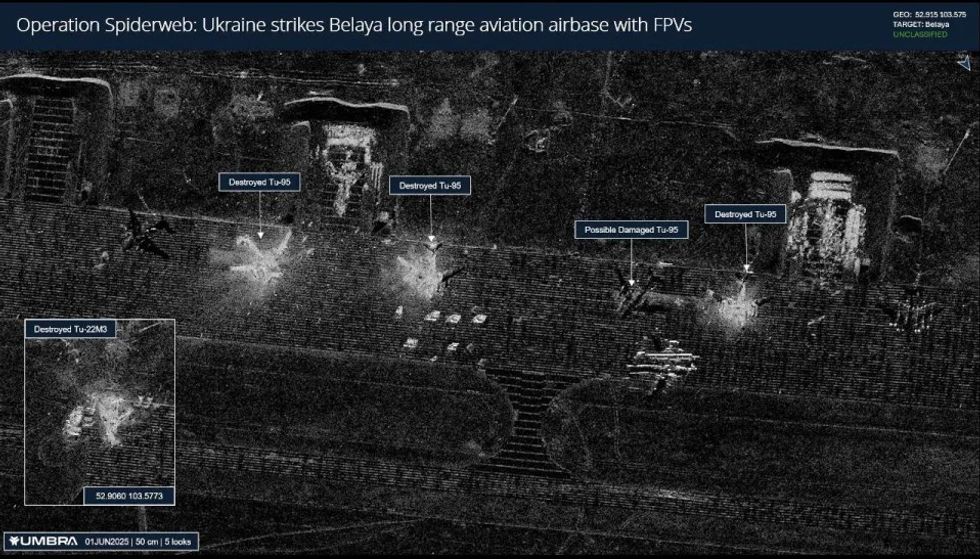 Dronët kamikazë të Ukrainës më pas filmuan veten duke fluturuar nëpër fushat ajrore dhe duke goditur aeroplanët - duke i shkatërruar ata.