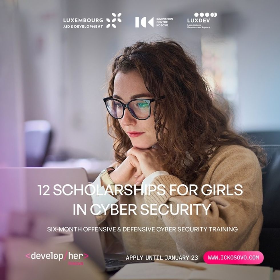 Innovation Centre Kosovo, nëpërmjet programit “DevelopHer”, në bashkëpunim me LuxDev, Agjencinë për Bashkëpunim Zhvillimor të Luksemburgut, ofron 12 bursa të plota për vajzat nga Kosova, për programin 6-mujor të trajnimit profesional në Siguri Kibernetike. Afati i fundit për aplikim: 23 Janar 2025.