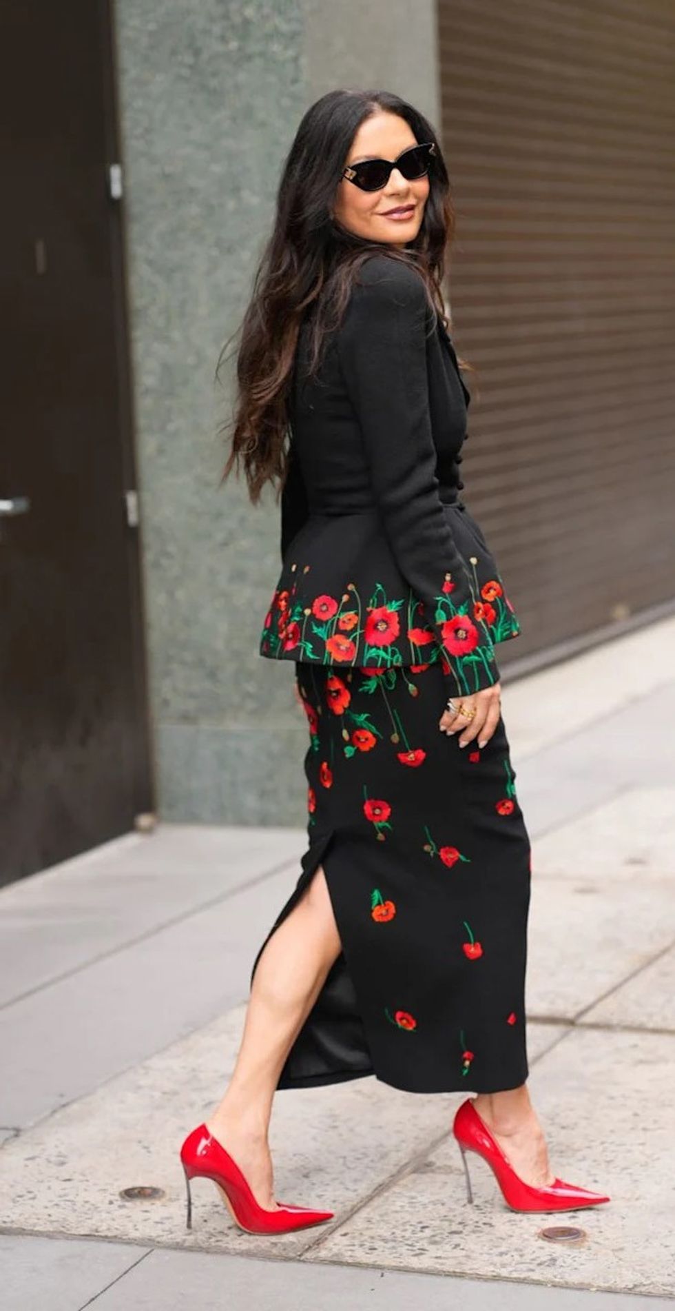 Diva e Hollivudit, Ketrin Zita Džouns, një herë tjetër ka treguar pse konsiderohet ikonë mode. Duke u shfaqur me një kostum tërheqës të zi me detaje lulesh të kuqe, aktorja ka konfirmuar se eleganca e vërtetë nuk del kurrë nga moda dhe që një model i mirë mund të bëjë mrekulli për figurën.