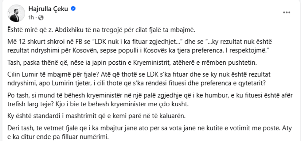 "Është mirë që z. Abdixhiku të na tregojë për cilat fjalë ta mbajmë. Më 12 shkurt shkroi në FB se “LDK nuk i ka fituar zgjedhjet...” dhe se “...ky rezultat nuk është rezultat ndryshimi për Kosovën, sepse populli i Kosovës ka tjera preferenca. I respektojmë.” Tash, paska thënë që, nëse ia japin postin e Kryeministrit, atëherë e rrëmben pushtetin. Cilin Lumir të mbajmë për fjale? Atë që thotë se LDK s’ka fituar dhe se ky nuk është rezultat ndryshimi, apo Lumirin tjetër, i cili thotë që s’ka rëndësi fituesi dhe preferenca e qytetarit?", shkruan ai.