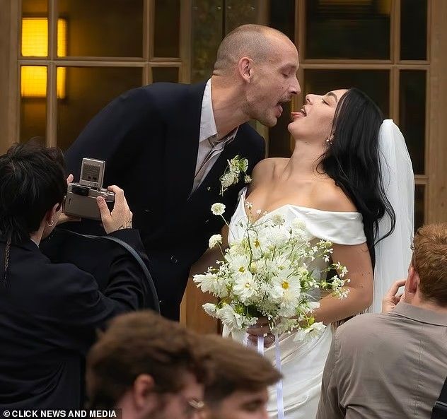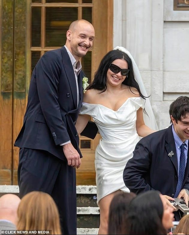Këngëtarja 32-vjeçare u shfaq me stilin e saj unik – me një fustan të shkurtë Vivienne Westwood, syze dielli dhe vello tradicionale, ndërsa bashkëshorti i saj mbante një kostum të errët dhe një lule në jakë që përputhej me buqetën e saj.