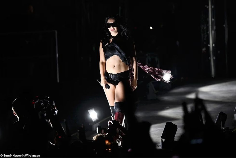 Ajo u shfaq me pantallona të shkurtë prej lëkure dhe një bluzë rrjetë, duke ndezur atmosferën me hite si “360”, “Speed Drive” dhe “Sympathy Is a Knife”.