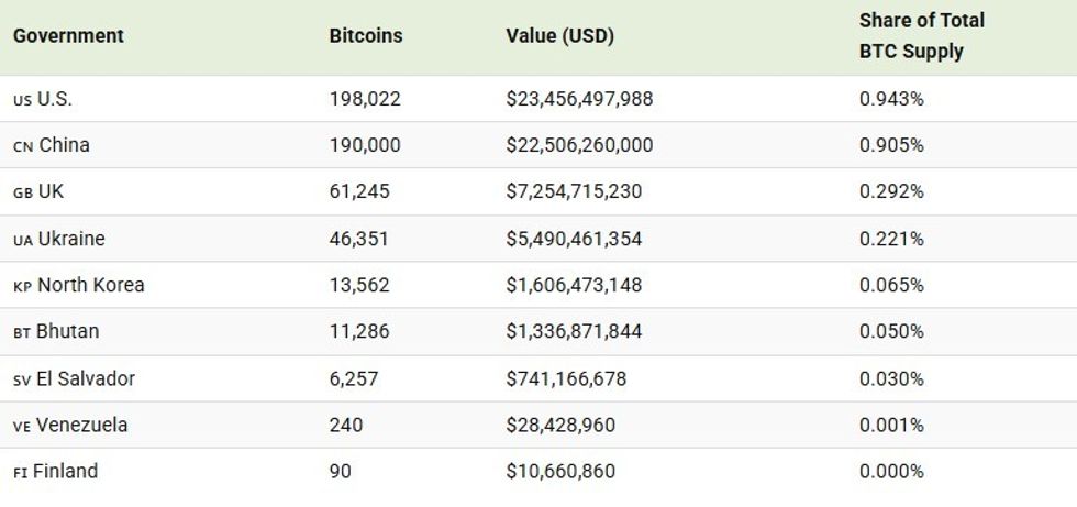 Kina ndodhet menjëherë pas SHBA-së, duke zotëruar 190 mijë BTC, me një vlerë prej rreth 22.5 miliardë dollarësh. Pavarësisht ndalimit të tregtimit të kriptovalutave për qytetarët, Kina ka mbajtur rezerva të mëdha nga konfiskime që lidhen me minierat dhe rastet e mashtrimeve.