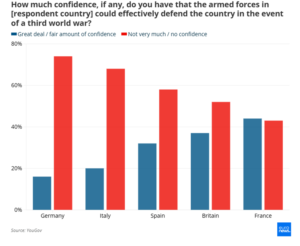 Katër vendet e tjera nuk kanë besim në aftësinë e forcave të tyre të armatosura për të mbrojtur vendin, veçanërisht Gjermania, ku vetëm 16 për qind kanë besim, dhe Italia me 20 për qind.