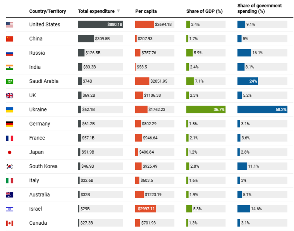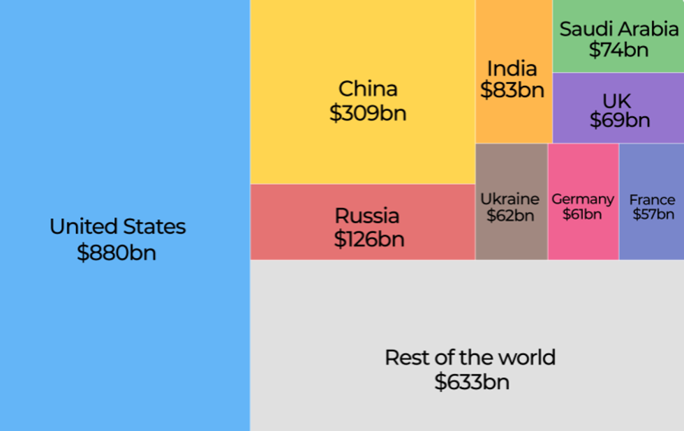 Kina është vendi i dytë që shpenzon më shumë me 309 miliardë dollarë, e ndjekur nga Rusia me 126 miliardë dollarë, India me 83 miliardë dollarë dhe Arabia Saudite me 74 miliardë dollarë.