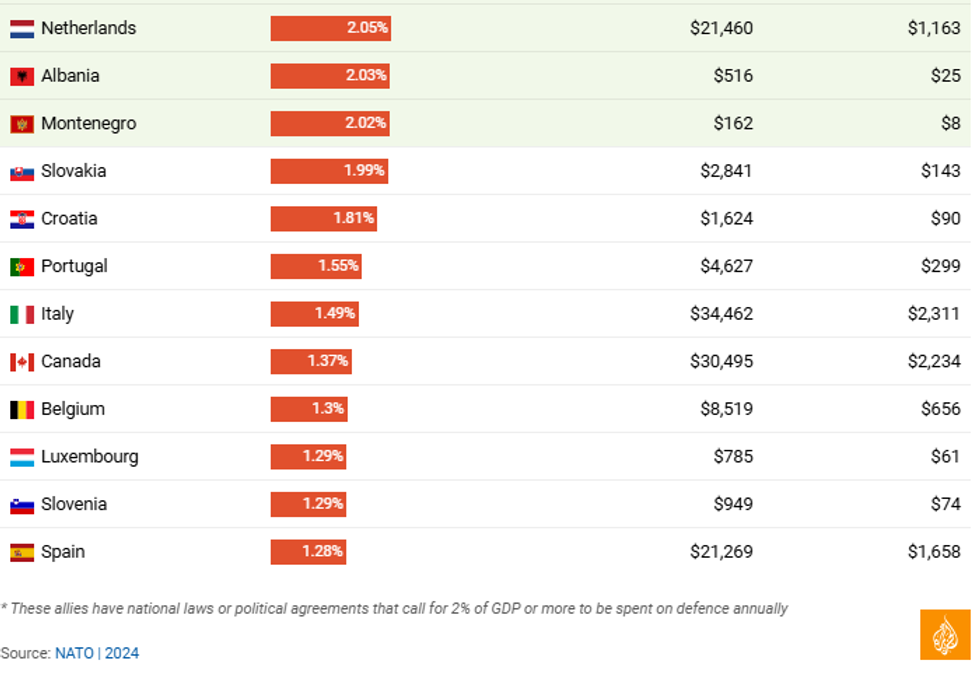 Aktualisht, dy të tretat e anëtarëve të saj (23 nga 32) e kanë përmbushur këtë angazhim, duke rritur paratë e shpenzuara për mbrojtjen nga të gjithë anëtarët e NATO-s në 1.47 trilion dollarë në vitin 2024.