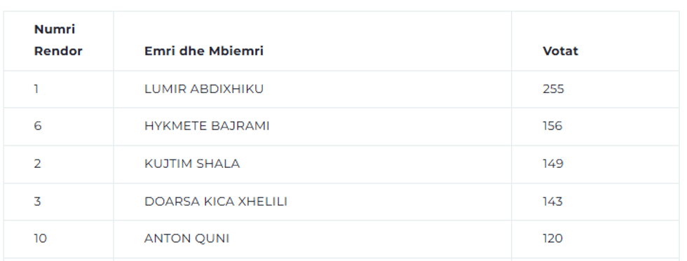 Kandidati tjetër më i votuar është Kujtim Shala me 149 vota, pastaj kandidatja Doarsa Kica Xhelili me 143 vota.