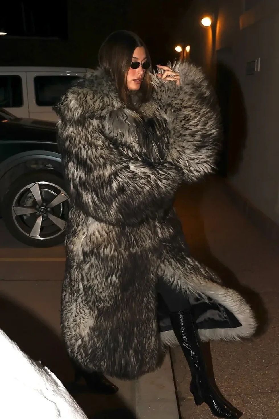 Bieber zgjodhi këtë kombinim: një pallto me gëzof, të kombinuar me streçe të zeza dhe çizme lëkure me shkëlqim.