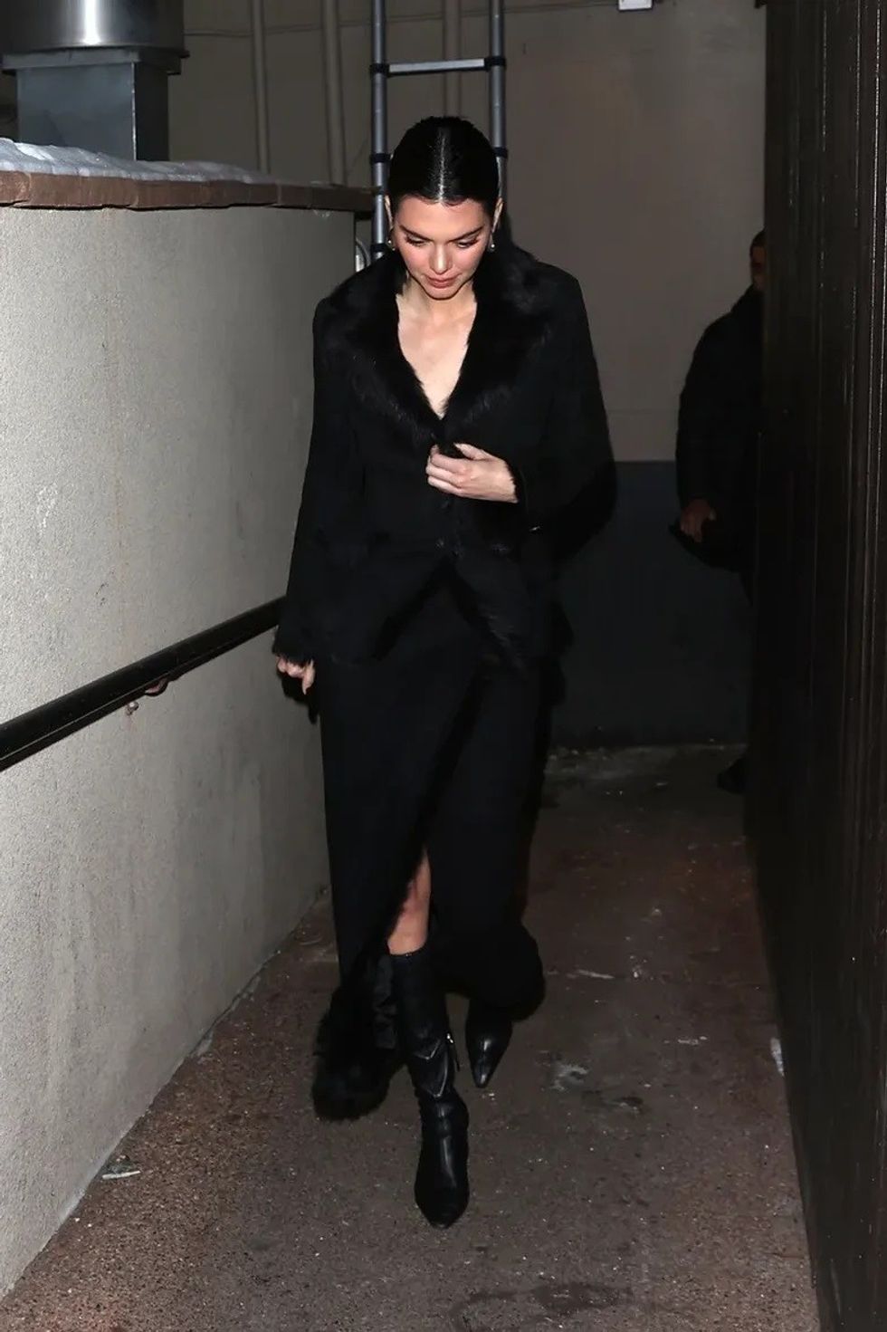 Nga ana tjetër, Jenner mahniti me një fund të gjatë të zi të thurur me pelush, plotësuar nga çizmet e saj të sofistikuara prej lëkure.