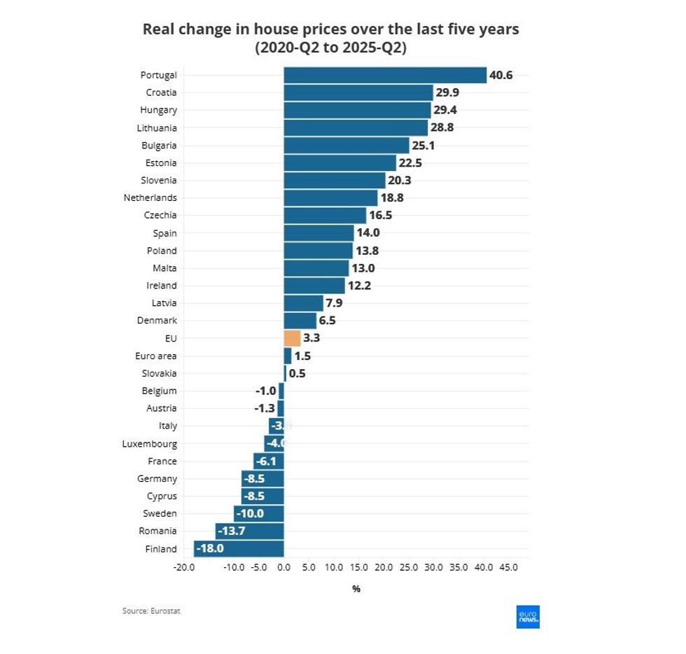 Midis tremujorëve të dytë të vitit 2020 dhe 2025, çmimet reale të shtëpive u rritën më dramatikisht në Portugali, me 40.6%. Portugalia dallohet, me të gjitha vendet e tjera që po rriten me më pak se 30%.