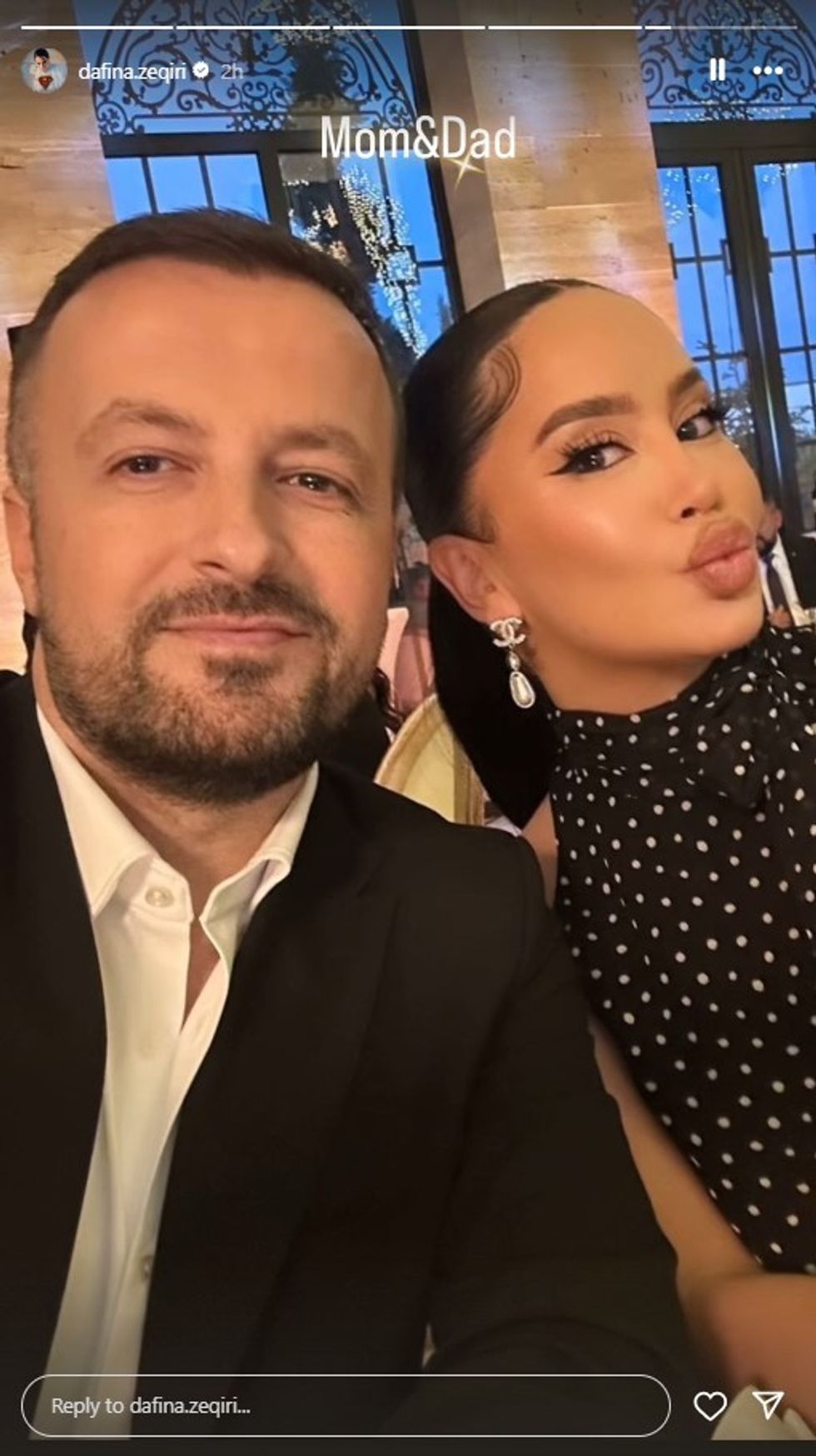 Të veshur me elegancë dhe me buzëqeshje të ndritshme në fytyrë, Dafina dhe Kreshniku rrezatuan lumturi, ndërsa postimi u shoqërua me përshkrimin: “Mami & Babi”.