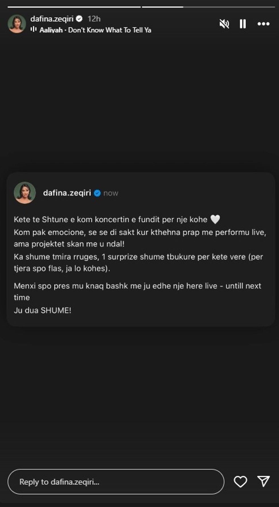 Dafina shton se ka “shumë të mira rrugës”, duke lënë të kuptohet se, pavarësisht pushimit nga koncertet, ajo do të vazhdojë të jetë aktive me projekte muzikore. “Një surprizë shumë të bukur për këtë verë (për tjerat s’po flas, ia lë kohës)”, shkroi ajo, duke ngjallur kureshtjen e fansave për çfarë po përgatit.