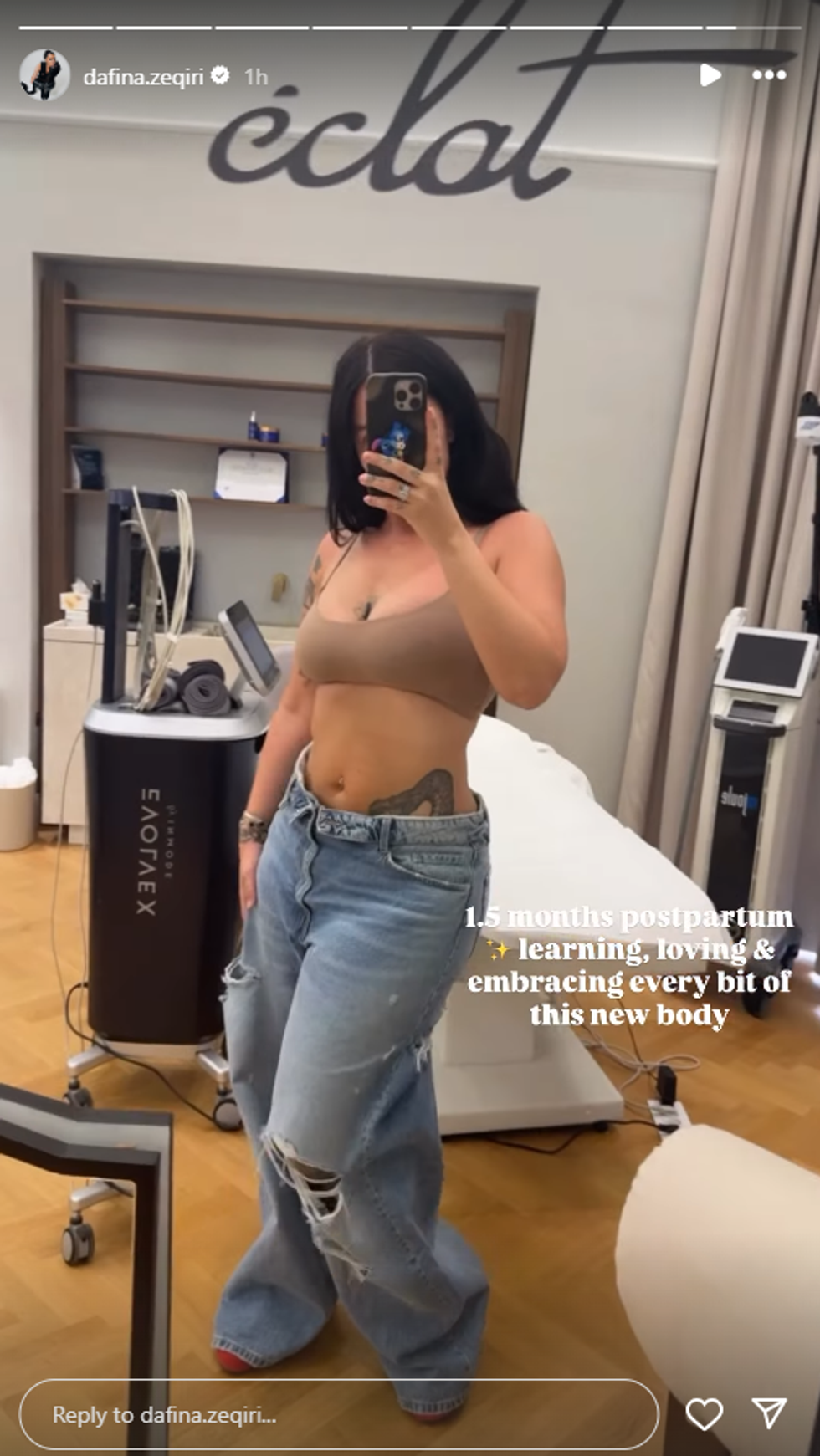 Edhe pas një muaji e gjysmë, pasi që u bë nënë, Dafina duket se ka pranuar dhe përqafuar këto ndryshime natyrale. Ajo ka publikuar një video në Instagram ku tregon se si trupi i saj ka ndryshuar – përjetimi që çdo nënë kalon.