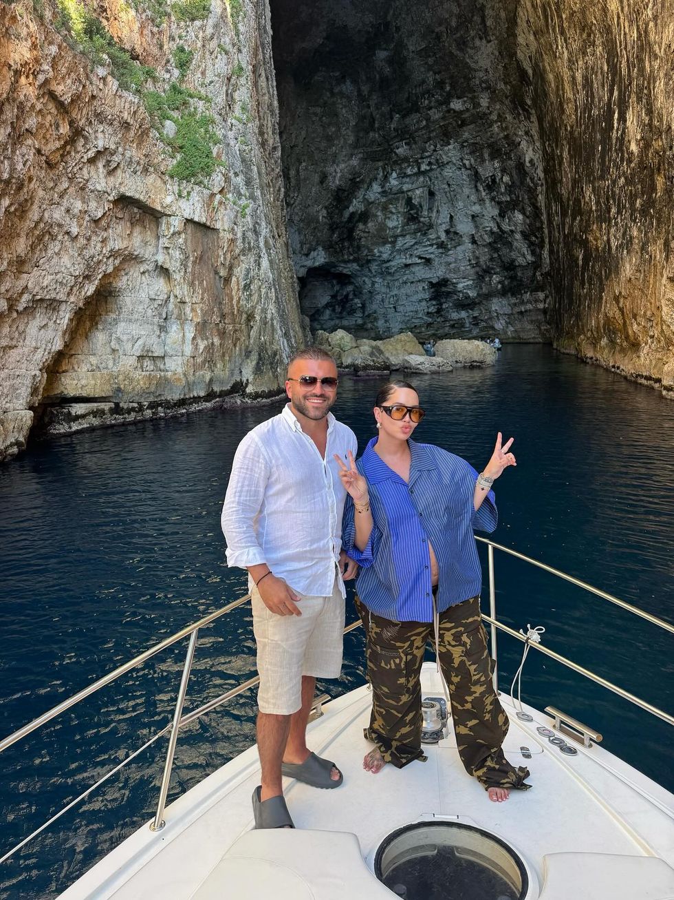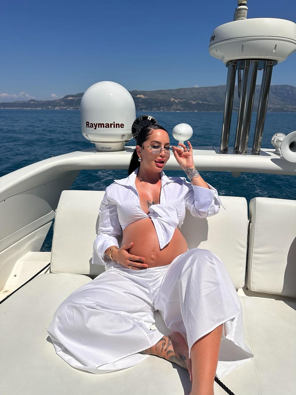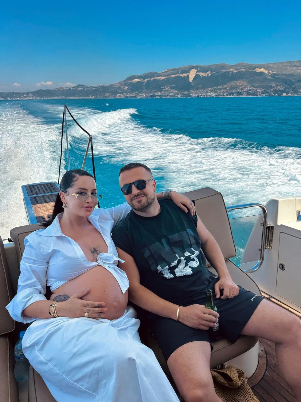 Dafina Zeqiri pozon me barkun e rrumbullakosur në jaht – shijon bukuritë e Karaburunit me bashkëshortin