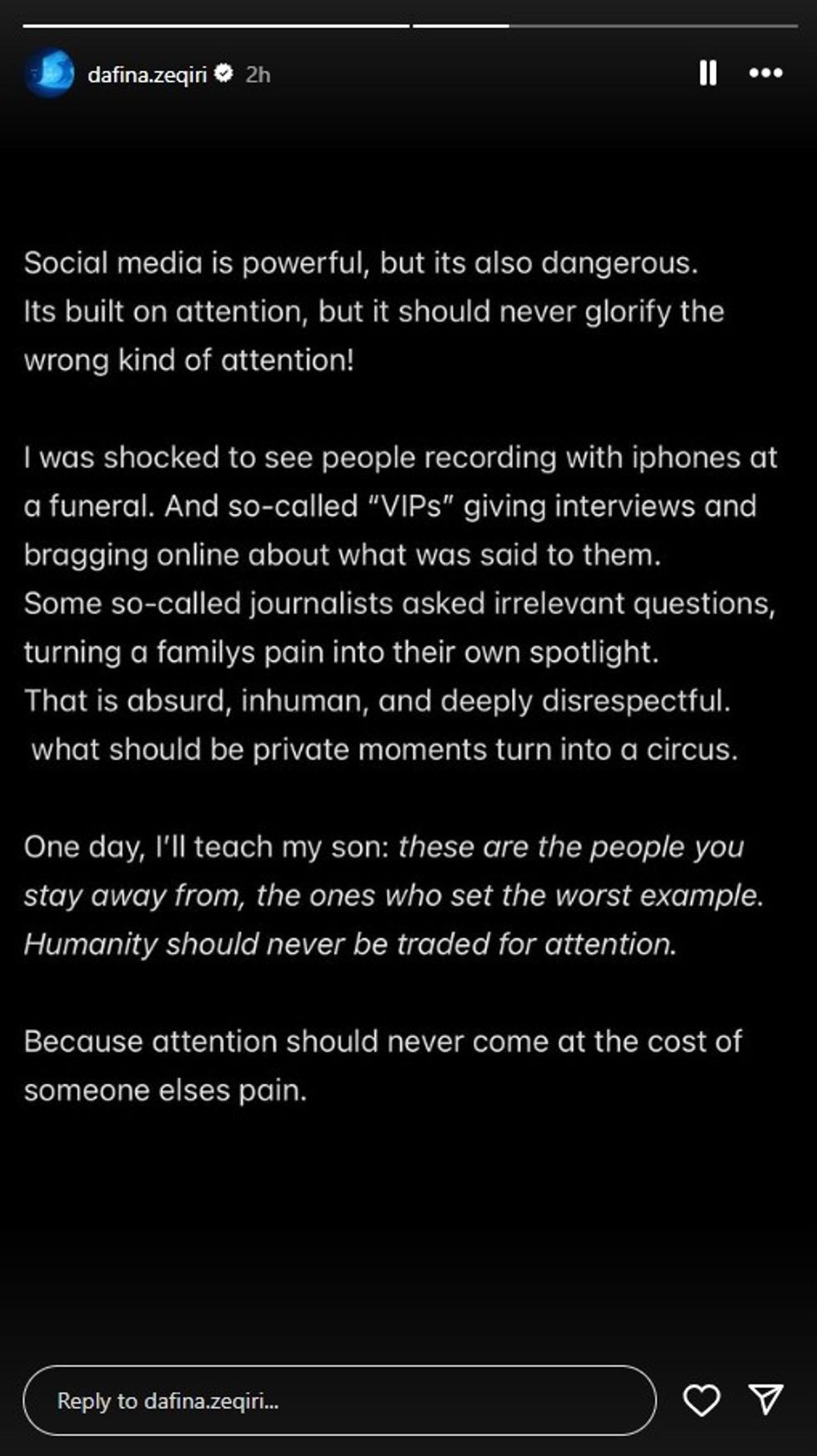 “Rrjetet sociale janë të fuqishme, por gjithashtu të rrezikshme. Janë ndërtuar mbi vëmendjen, por nuk duhet të glorifikojnë llojin e gabuar të saj. U trondita kur pashë njerëz duke xhiruar me telefona në një varrim. Dhe disa ‘VIP-a’ që jepnin intervista e mburreshin online me atë që u ishte thënë. Disa të ashtuquajtur gazetarë bënin pyetje të parëndësishme, duke e kthyer dhimbjen e një familjeje në skenë për veten e tyre. Kjo është absurde, çnjerëzore dhe thellësisht mosrespektuese. Momente që duhej të ishin private, u kthyen në një cirk,” shkroi këngëtarja.