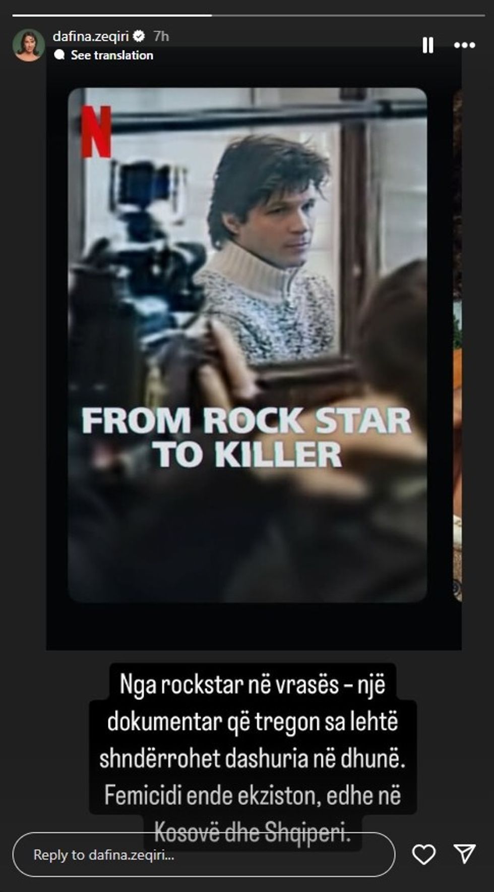 "Nga rockstar në vrasës – një dokumentar që tregon sa lehtë shndërrohet dashuria në dhunë. Femicidi ende ekziston, edhe në Kosovë dhe Shqipëri", ka shkruar ajo në InstaStory, duke shprehur shqetësimin e saj për këtë problem serioz.