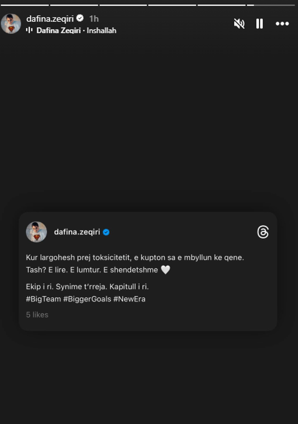 Përveç kësaj, Dafina ka paralajmëruar një fillim të ri në aspektin profesional, duke thënë: “Ekip i ri. Synime të reja. Kapitull i ri”.