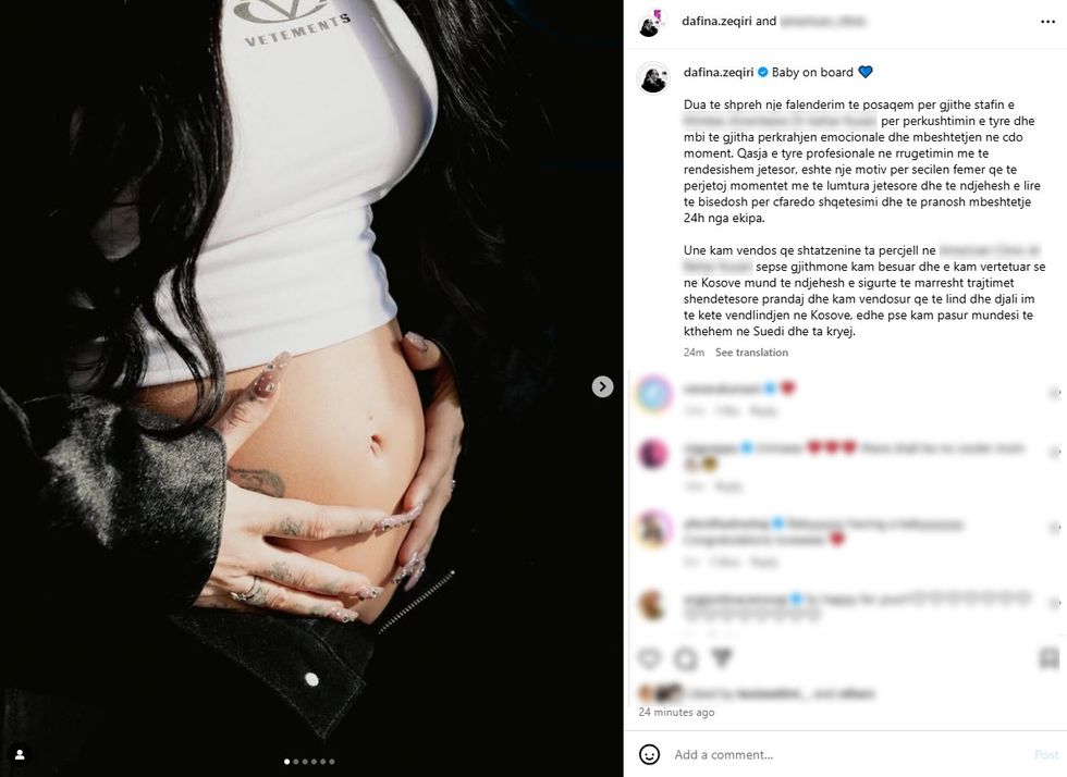 "E kam vërtetuar se në Kosovë mund të ndjehesh e sigurtë të marrësh trajtimet shëndetësore prandaj dhe kam vendosur që të lind dhe djali im të ketë vendlindjen në Kosovë, edhe pse kam pasur mundësi të kthehem ne Suedi dhe ta kryej", tha ndër të tjerash Dafina.