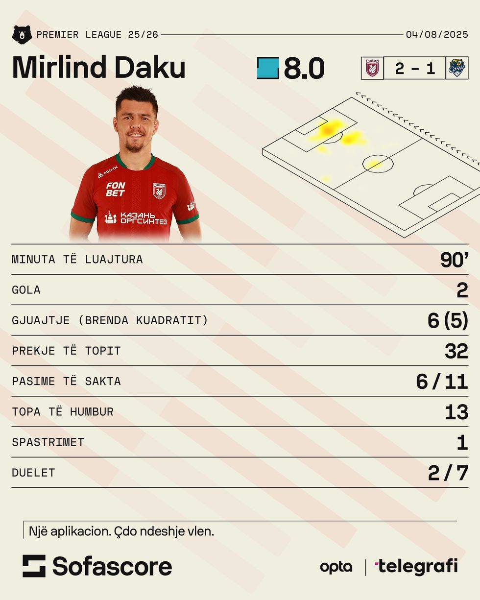 Mirlind Daku ka shënuar katër gola deri më tani, tre në kampionat dhe një tjetër në Kupën e Rusisë, duke konfirmuar rolin e tij si një nga lojtarët kyç të ekipit. /Telegrafi/