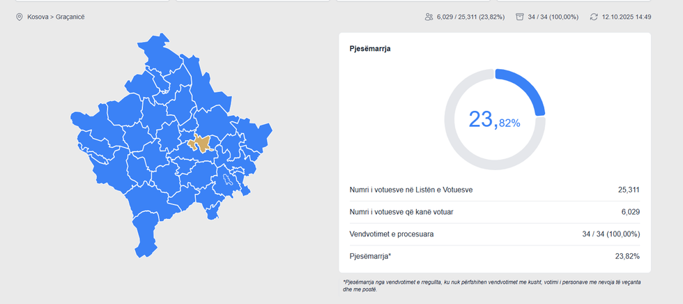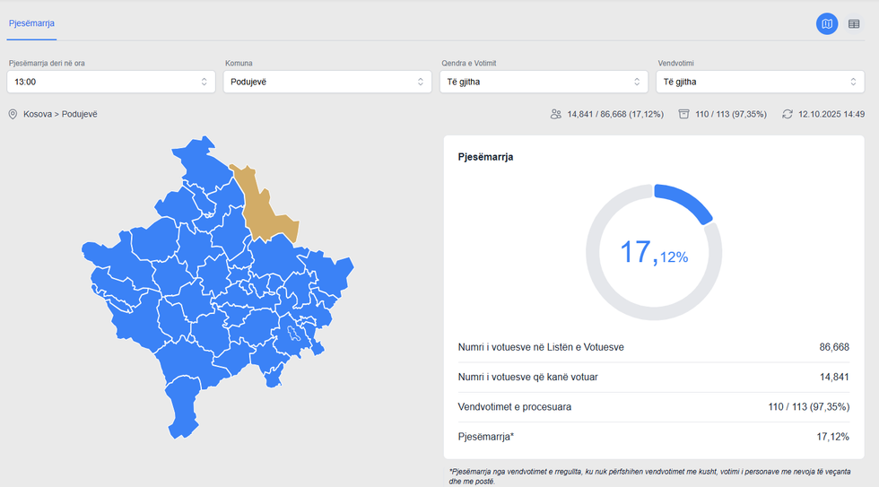 Në Podujevë, deri në orën 13:00 kanë votuar vetëm 17.12% e qytetarëve (14,841 nga 86,668), ndërsa pjesëmarrjen më të lartë në rajonin e Prishtinës e mban Graçanica, me 23.82%, që përfaqëson 6,029 votues nga 25,311 të regjistruar. /Telegrafi/