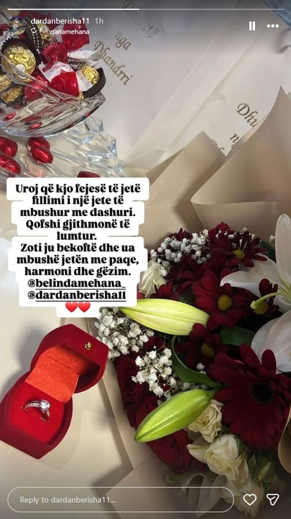 Lajmi është bërë i ditur përmes një fotografie, ku përveç unazës së fejesës, vëmendjen e ka marrë edhe pusulla e vendosur mbi lulet, me mbishkrimin epik: “Dhuratë nga Dhandrri”, detaj që ka nxitur reagime dhe komente të shumta në rrjete sociale.