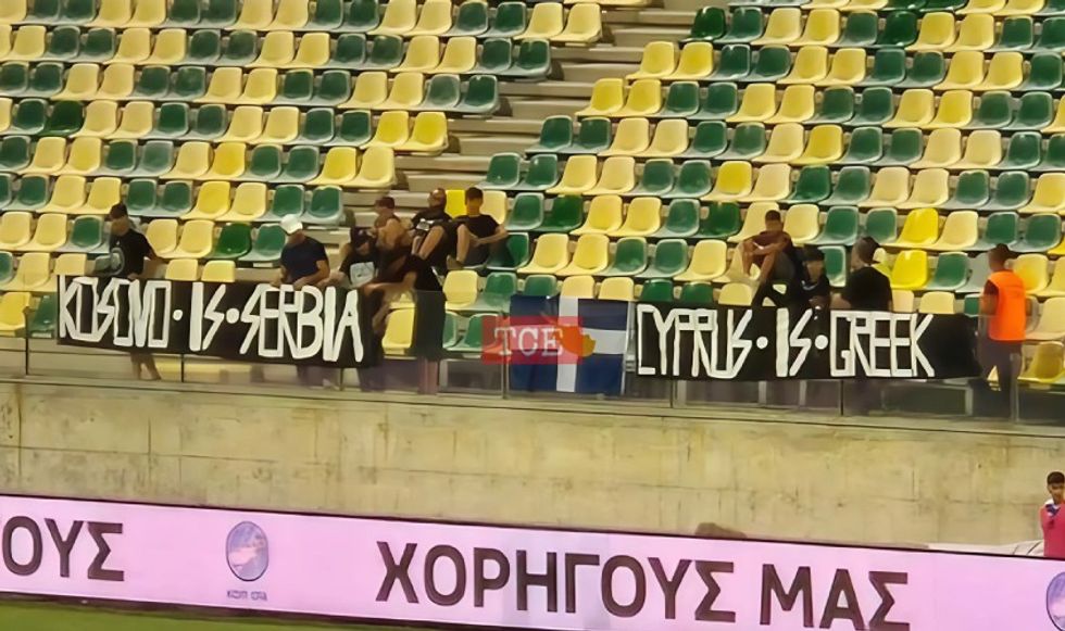 Tifozët qipriot u shfaqën pankartat "Kosova është Serbi" dhe u desh të ndërhynte sigurimi për të larguar ato nga tribuna, për të nisur ndeshja.