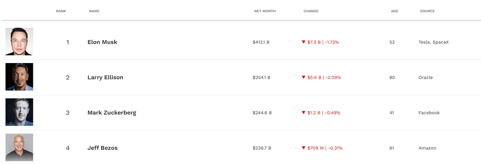 Në krye të listës qëndron rivali i tij më i madh në sektorin teknologjik, Elon Musk, pasuria e të cilit vlerësohet të jetë rreth 412.1 miliardë dollarë.