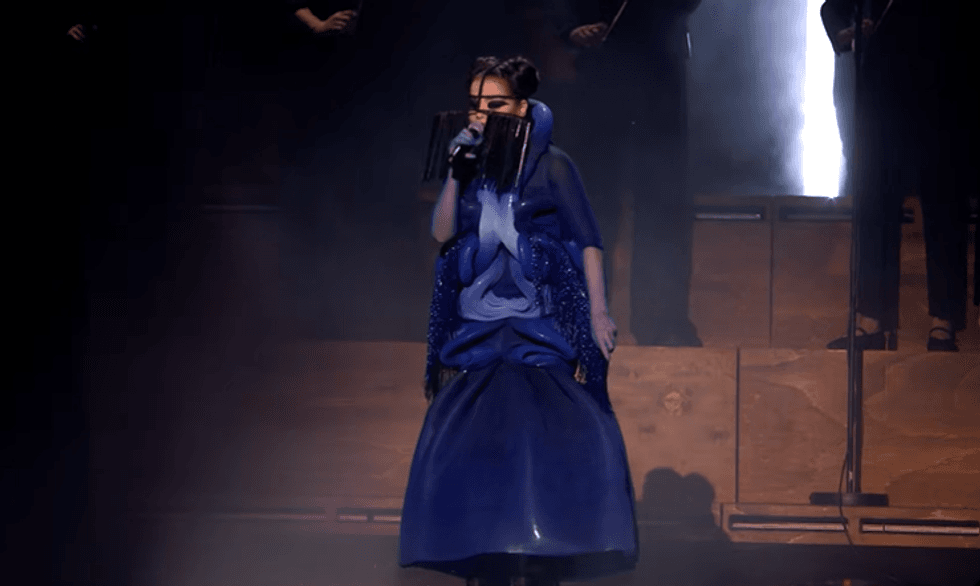 Këngëtarja islandeze mbante një kostum avangardë me mbulesë koke të mbushur me rruaza, që dukej sikur fluturonte rreth saj.