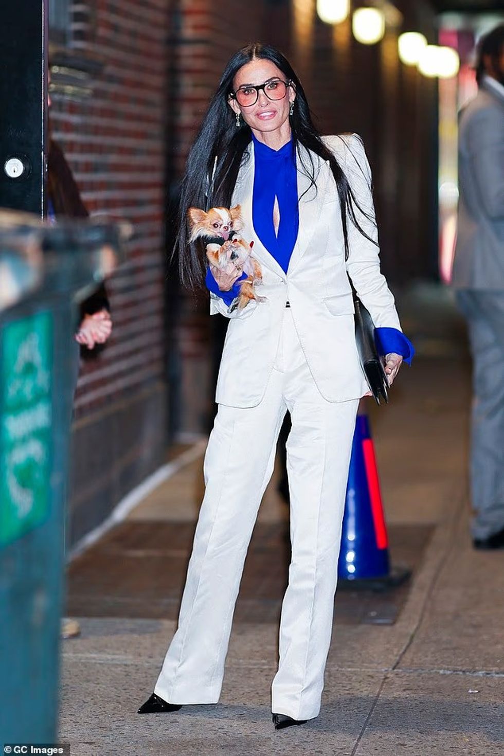 Demi Moore ishte shembulli i sofistikimit mbrëmjen e së hënës, teksa u drejtua drejt “The Late Show With Stephen Colbert” në qytetin e New Yorkut, e shoqëruar, si gjithmonë, nga qeni i saj i dashur, Pilaf.