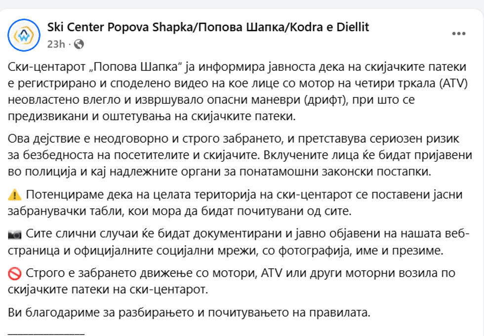 “Ski Qendra “Kodra e Diellit” informon opinionin publik se nëpër pistat e skijimit është regjistruar dhe shpërndarë një video ku një person me motor me 4 rrota (ATV) ka hyrë pa leje dhe ka kryer manovra të rrezikshme (drift) duke dëmtuar edhe pistat e skijimit. Ky veprim është i papërgjegjshëm dhe i ndaluar rreptësisht, duke paraqitur rrezik serioz për sigurinë e vizitorëve dhe skijuesve".